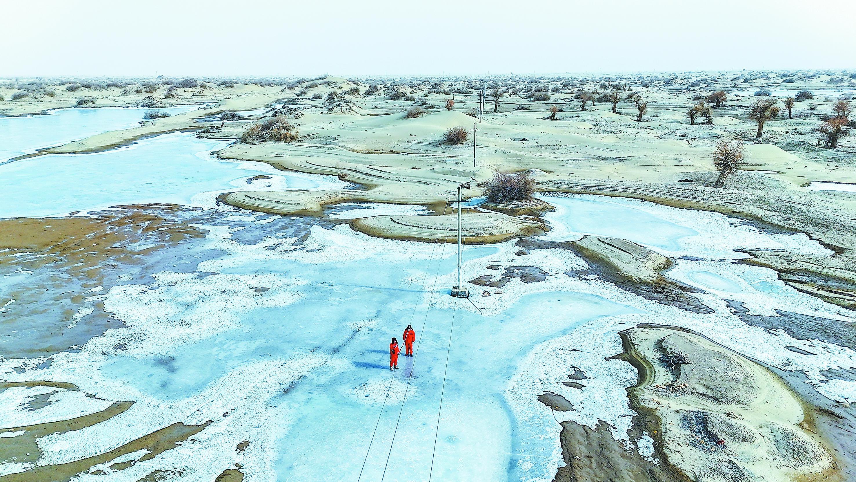 外线班守护着西北油田南疆大漠油区4000多公里输电线路的安全,皮卡到达不了的偏远地段,只能徒步巡检。“今年春节假期长,电力保供压力大,我们要重点巡护高负荷线路。”56岁的李照军,在这个岗位已经干了30年,“今天我们主要巡检10千伏线路,步行路段得走五六个小时。”