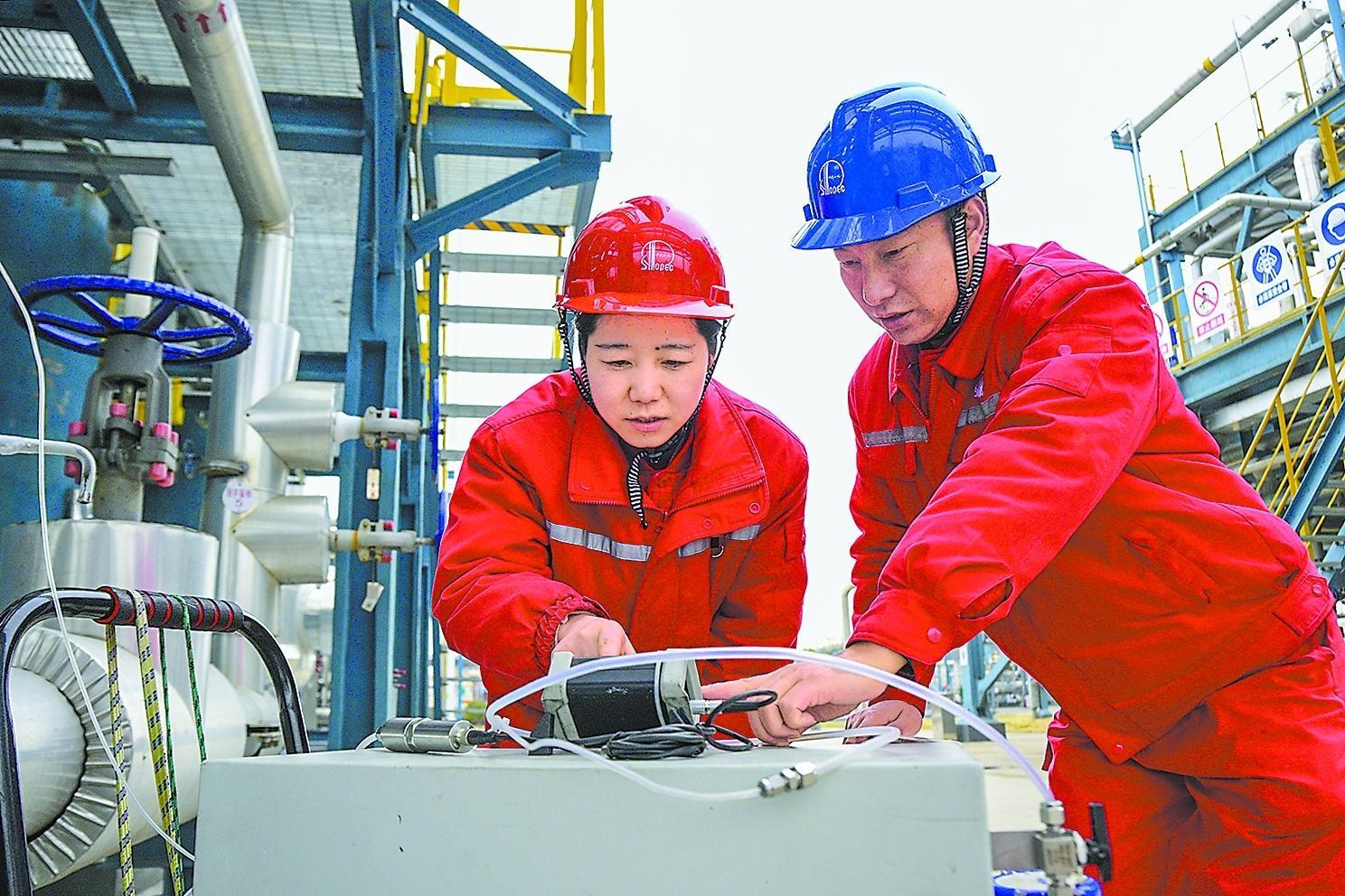 华东油气分公司CCUS调峰中心持续加强巡检和设备保养工作,每日向泰州采油厂二氧化碳驱油项目供应近700吨高纯度液碳,为增储上产注入绿色动能。图为2月24日员工进行液碳露点测量。本报记者 沈志军 摄 李 星 文