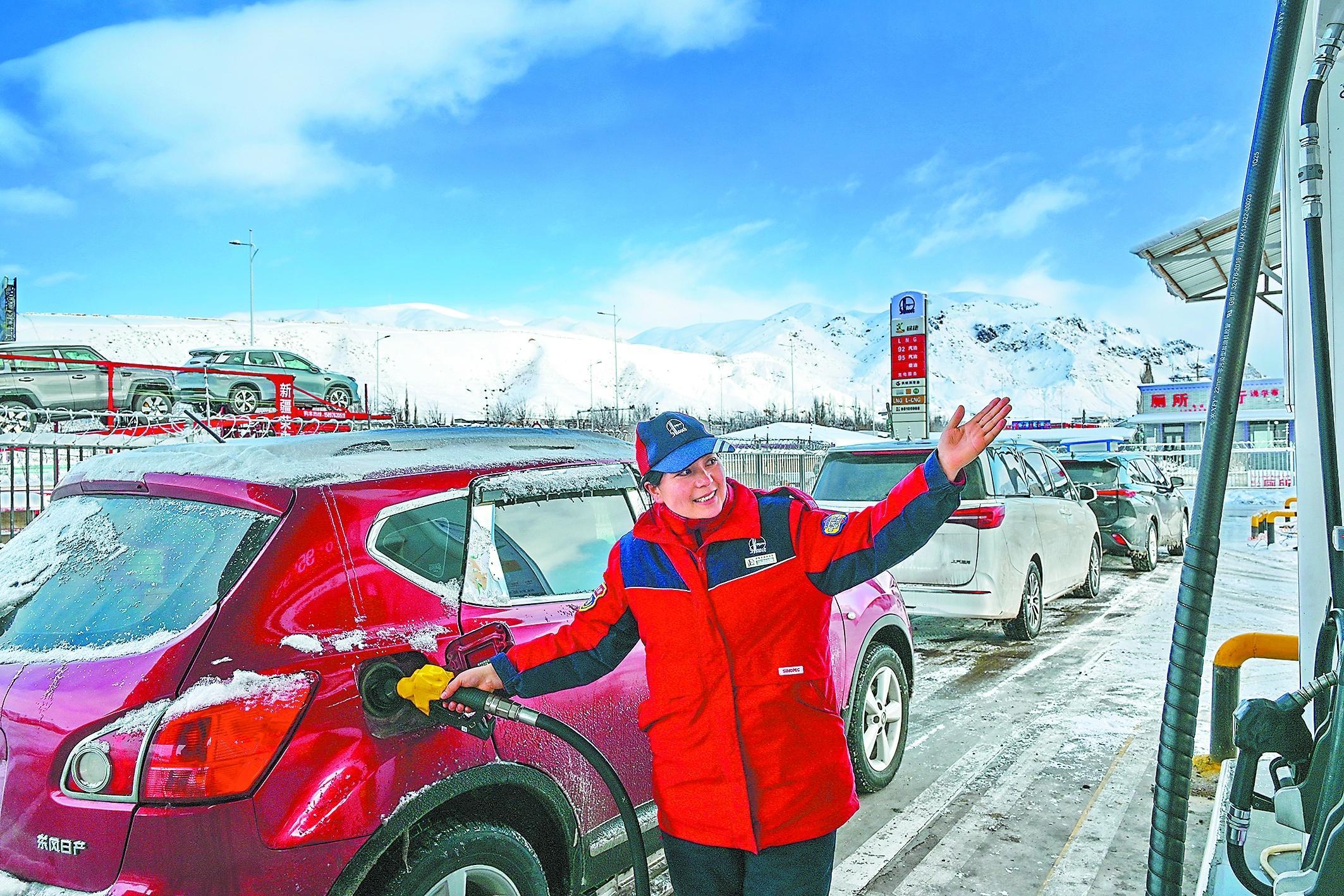 新疆石油积极应对降雪天气,加强能源保供和顾客服务,以热情服务温暖顾客旅途。图为3月1日新疆伊犁石油果子沟加能站员工服务返疆车主。本报记者 胡庆明 摄 毛 杰 孙 筱 文