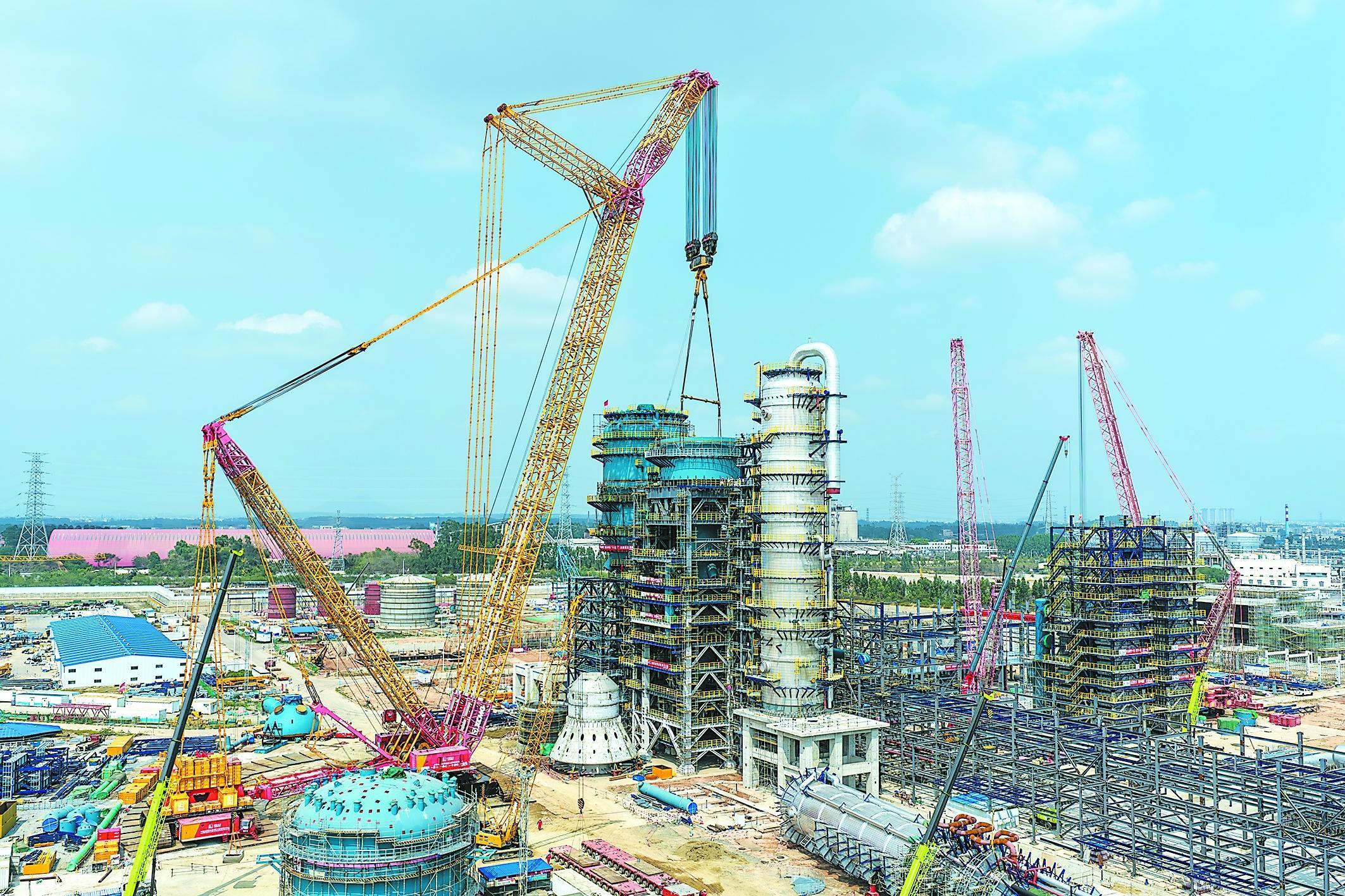 3月8日,茂名石化升级改造项目RTC(重油高效催化裂解)联合装置核心设备反应器裙座段顺利吊装就位。该裙座段最大直径15米,高度超过12米,吊装总重234.2吨,采用4000吨履带式起重机独立完成吊装。茂名石化联合项目管理公司,组织工程建设公司、四建公司、起运公司等参建单位,提前开展方案推演、风险排查和技术交底,确保吊装作业一次成功。图为吊装现场。