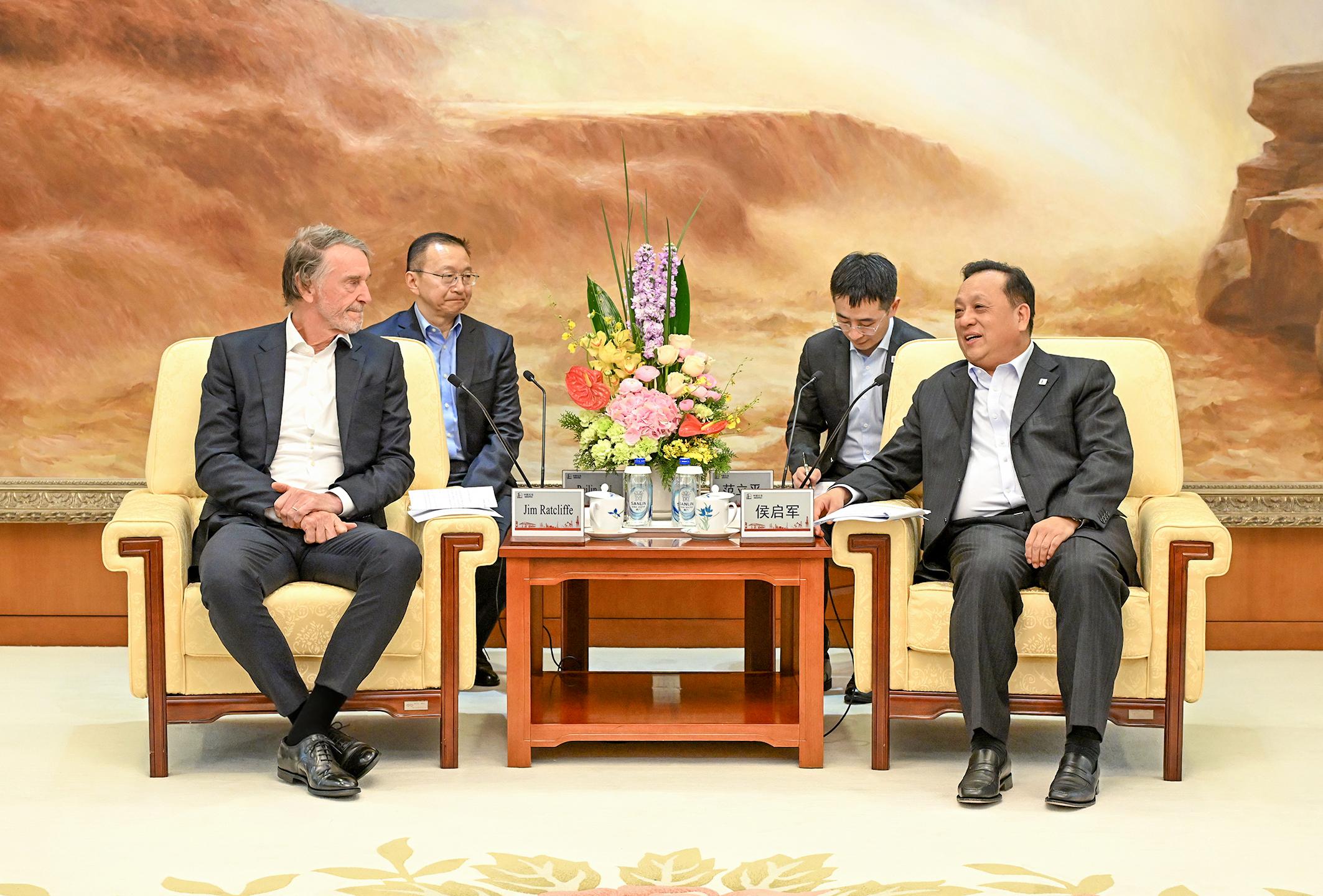 3月13日,集团公司董事长侯启军在总部会见英力士集团创始人兼董事会主席拉特克里夫爵士,双方就相关领域合作交换了意见。集团公司副总经理万涛参加会见。图为会见现场。