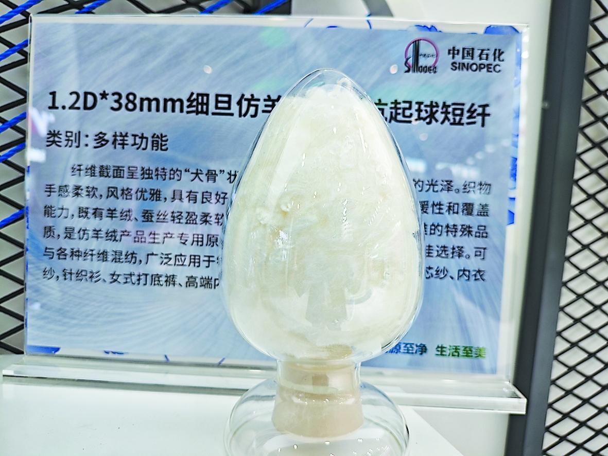 “绿色生活”板块集中展示了中国石化在可持续发展领域的探索成果。物理再生纤维采用再生切片制造,实现从原料到成品的全链条资源循环,性能媲美常规涤纶并获GRS(全球回收标准)认证,适用于高端缝纫线及棉纺混纺。技术含量更高的化学再生纤维则通过化学解聚技术将废弃聚酯完全降解后重新纺丝,实现资源闭环利用,不仅原料来源广泛、成本优势明显,而且制得的纤维形态规整、色泽稳定,性能不逊于常规涤纶,可广泛应用于高端正装、精品家纺等领域,显著降低碳足迹。此外,27.78dtex半消光扁平腈纶短纤凭借优异的高仿真度,广泛应用于中高档人造毛皮、高级毛毯等领域。