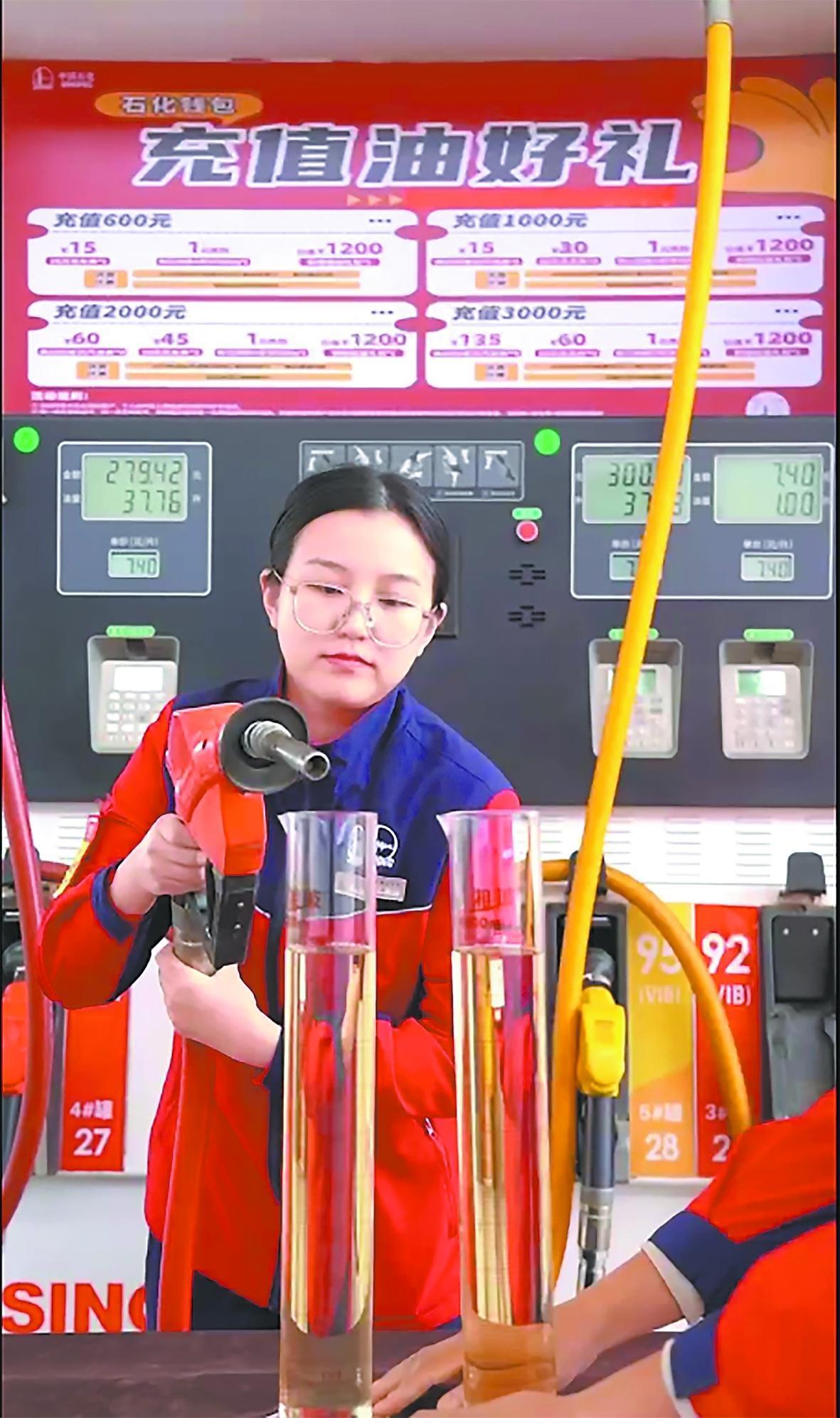 首先用反复捏枪的方式往量筒内加注1升92号汽油,然后用另一量杯一次性加注1升92号汽油。
