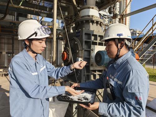 图3:茂名石化紧盯农膜原料市场需求,聚焦农膜、地膜专用料生产,优化装置运行,精细调整工艺参数。今年以来累计生产聚乙烯DFDA‑7042近2万吨,有力保障下游农膜企业生产供应。图为员工在现场检查聚乙烯DFDA‑7042颗粒料质量。 谭婵飞 摄 张亚培 文