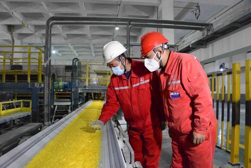 图2:西南油气分公司加强元坝气田和川西气田的硫黄生产,强化产销高效协同,日产销硫黄达1800吨,全力保障下游化肥企业备料生产。图为元坝气田净化厂硫黄生产车间技术员检查硫黄产品质量。 黄 莹 摄 袁 鹏 文