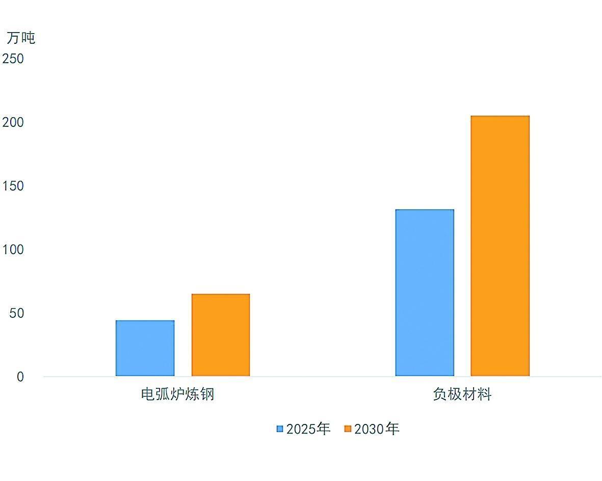 针状焦是生产超高功率石墨电极不可或缺的原材料,而超高功率石墨电极是大型电弧炉炼钢的核心部件。2025年,石墨电极生产对针状焦消费量约44万吨,占针状焦总消费量的25%。我国是全球最大的钢材生产国,但目前仍以高碳排放的长流程炼钢为主,而以废钢为原料的短流程电炉炼钢占比较低,主要受制于废钢资源不足和成本较高,这一现象预计将随着废钢资源量不断增加和碳排放成本约束收紧而得到改善。“十五五”期间电弧炉炼钢将加快发展,从而带动对针状焦的需求增长。预计到2030年,石墨电极用针状焦需求量将增至65万吨,年均复合增长率约8%。