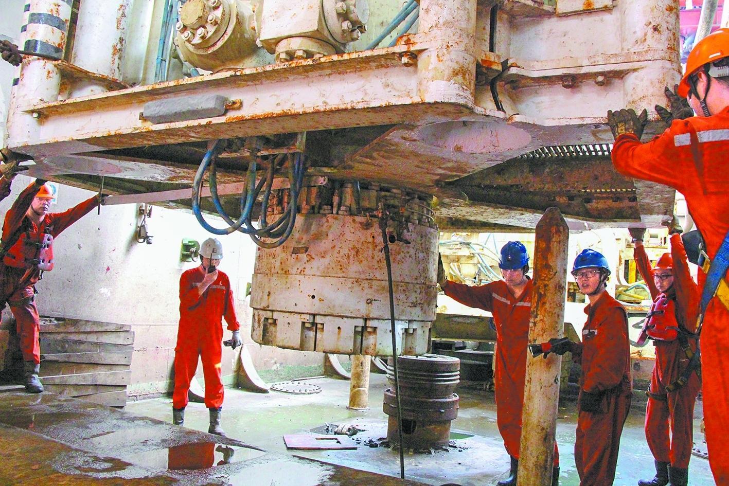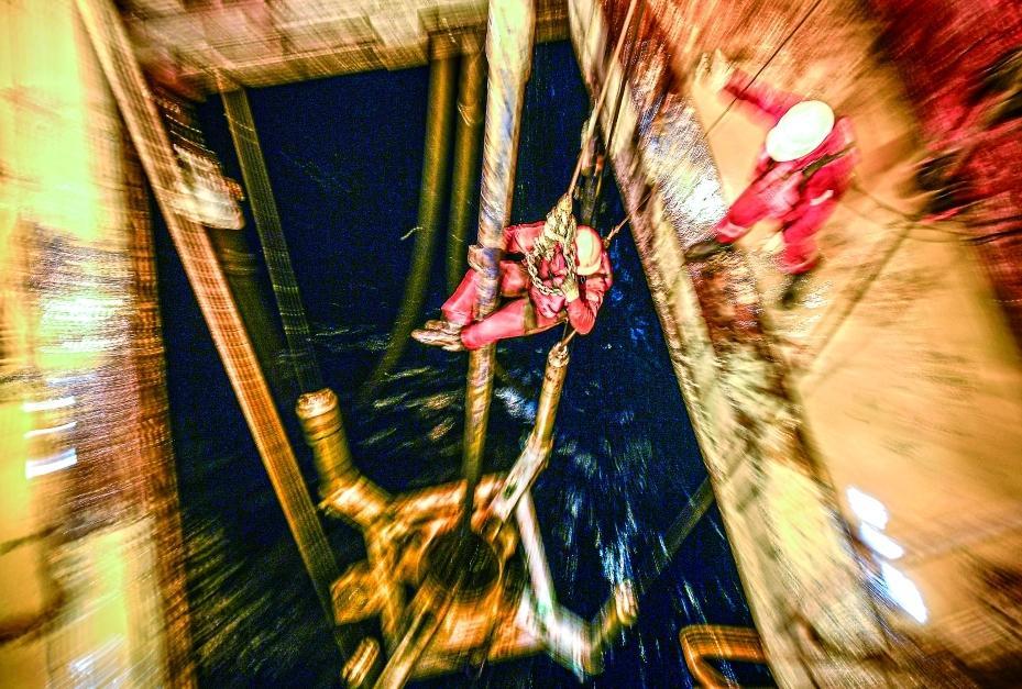 随着最后一根隔水管的提升,防喷器终于缓慢露出海面,海浪溅起5米高的浪花,防喷器如同大摆锤剧烈摇晃。“加快上提速度!”申磊通过对讲机急促地喊道。