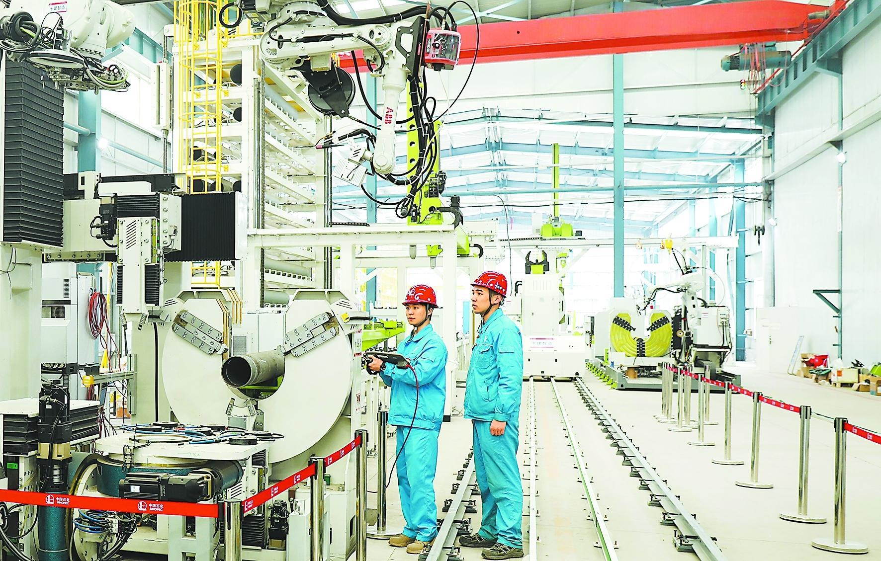 十建公司研发的国内首条管道智能预制生产线投入运行,17台(套)智能装备协同联动,实现自动上料、智能组对、机器人焊接等智能化预制目标,年管道预制生产能力可达20万寸径。图为4月16日十建公司研发人员对管道智能预制生产线运行状态进行检查。田元武 摄