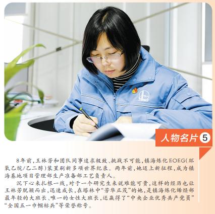 2019年,王林芳再次被委以重任,成为镇海基地项目管理部生产准备部工艺负责人。王林芳说:“第一套大乙烯是在我们手上开起来的,现在能够参与新乙烯的建设,真的是三生有幸。”