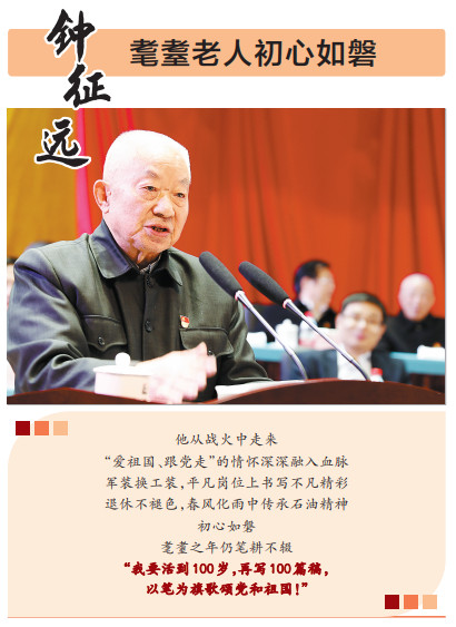 “我要活到100岁,再写100篇稿,以笔为旗歌颂党和祖国!”2020年,当钟征远颤抖着接过“中国人民志愿军抗美援朝作战70周年”纪念章时,那段波澜壮阔的峥嵘岁月仿佛穿越时间的尘埃,让这位有着70年党龄的老人热血沸腾,满眼都是奕奕的神采。