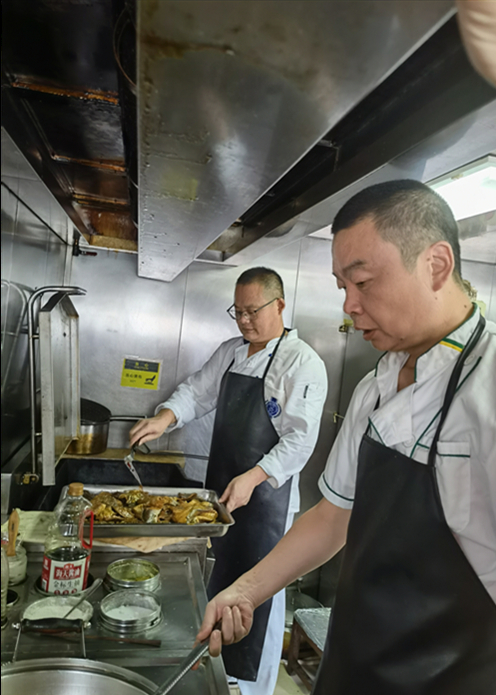于是,经常能看到厨师搭配创新各种佳肴,比如猪肉炖粉条、糖醋排骨、水煮肉片、剁椒鱼头、梅菜扣肉、红烧肉、红焖猪蹄、羊肉炕馍等等。二位厨师充分利用了炒、烧、煎、煮、蒸、烤不同的烹调方式,做出五花八门的南北方口味,色香味俱全,尽一切可能满足船员味觉需求,船员们无话可说,一致点赞。