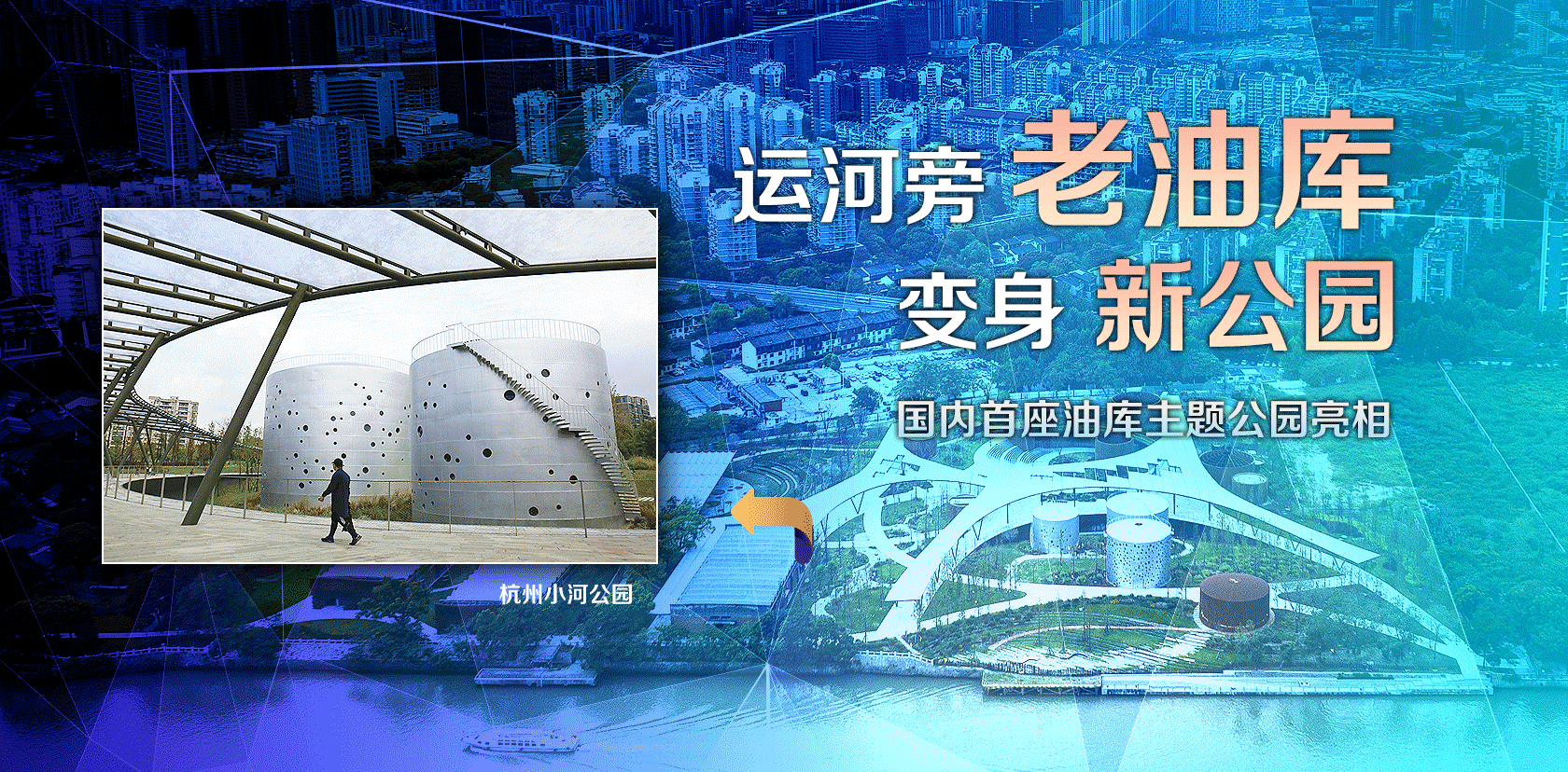 今年10月,北起拱宸桥,南临小河直街两大历史文化街区的杭州小河公园精彩亮相,作为大运河国家文化公园(杭州段)标杆项目之一,该公园保留了油库油罐和历史建筑等标志性文化,兼具岁月怀旧和时代新潮气息,以运河文化、小河文化、油库文化为纽带,讲述历史故事,成为当地网红地标。