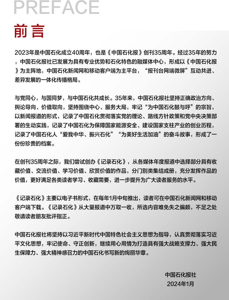 作为记录中国石化历史的中国石化报社,通过这种形式,较好地记录下一年来集团公司重要事件、重要报道、重要文章,很有必要,便于干部员工查阅与阅读,也集中诠释了中国石化“爱我中华、振兴石化”“为美好生活加油”的奋斗故事。