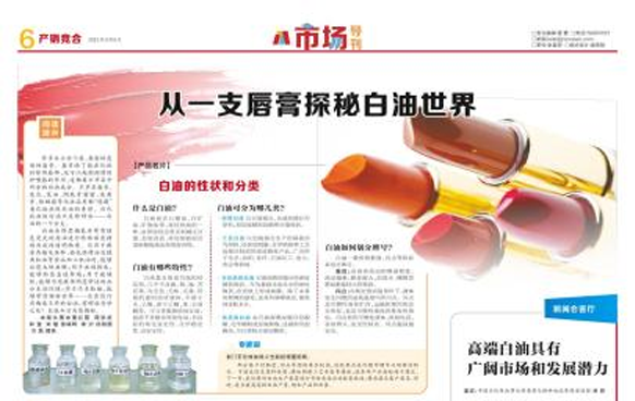 白油:别名石蜡油、白矿油、矿物油等,是特种油的一种,由原油经过常压和减压分馏、加氢改质,再加氢精制后得到精炼液态烃的混合物。