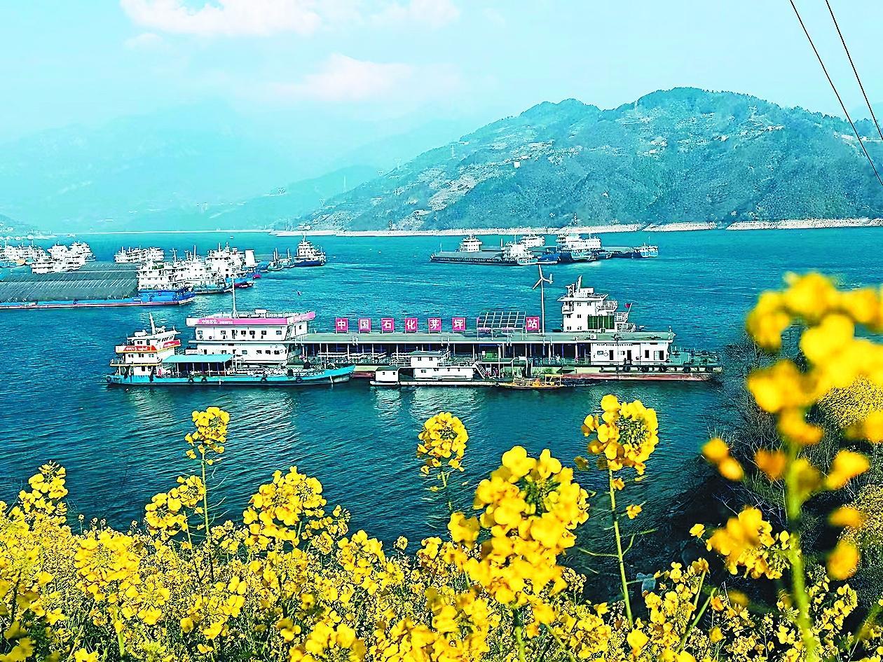 长江水面波光粼粼,江风习习。翻过一座小山,走过员工自己铺设的石板路,坐上交通艇行驶两分钟,茅坪水上加能站的牌子便跃然眼前。登上趸船,输油管道横亘在船中央,一排排润滑油桶整齐划一地排开。记者站在船上向远方望去,“高峡出平湖”的壮丽景观尽收眼底。