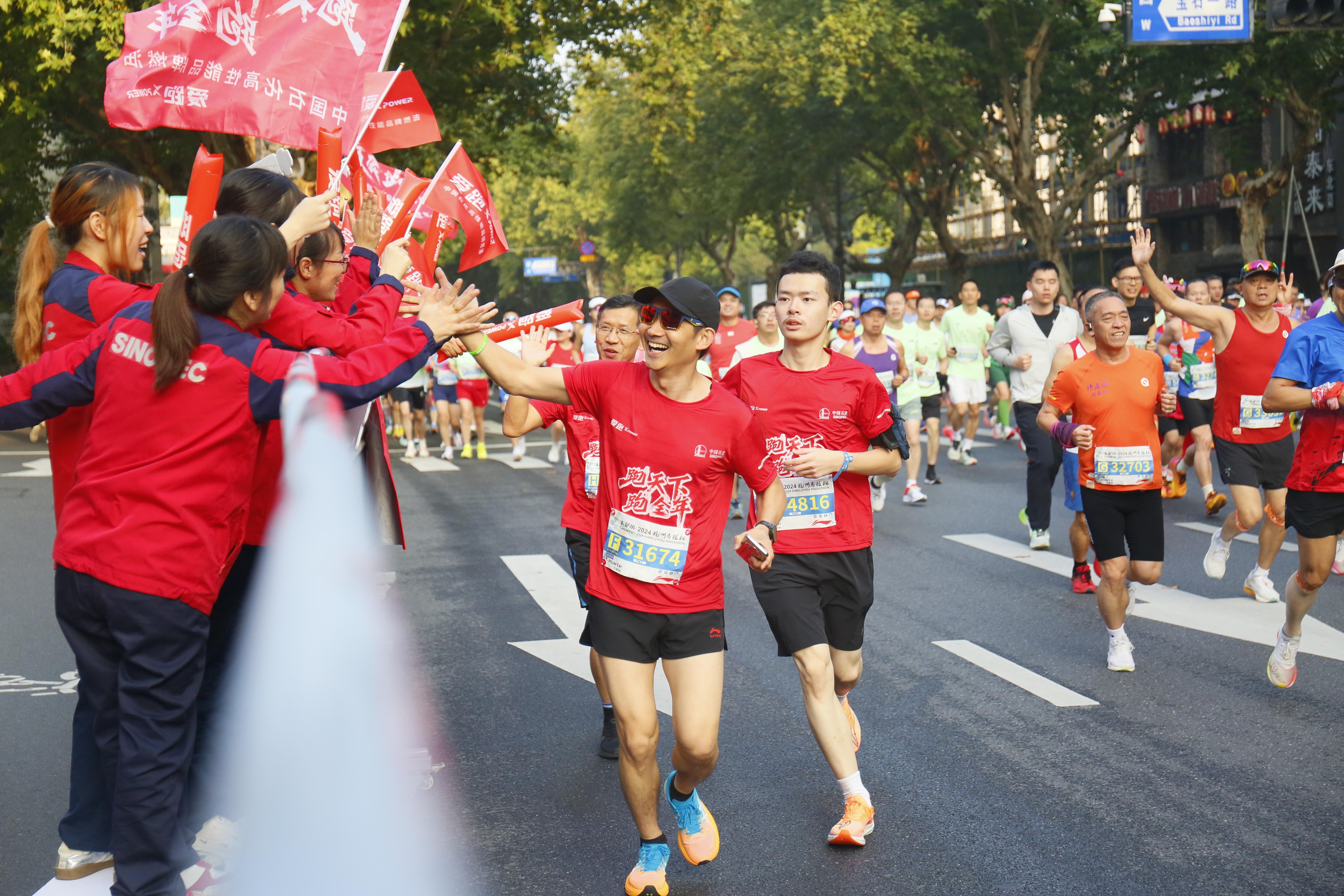 11月3日,2024杭州马拉松赛事鸣枪起跑,浙江石油前期线下招募198名“爱跑英雄”,在赛事途经点及终点,精心打造能源补给站,组建爱跑啦啦队,通过丰富多样的形式为跑友助力。龚良奇 摄