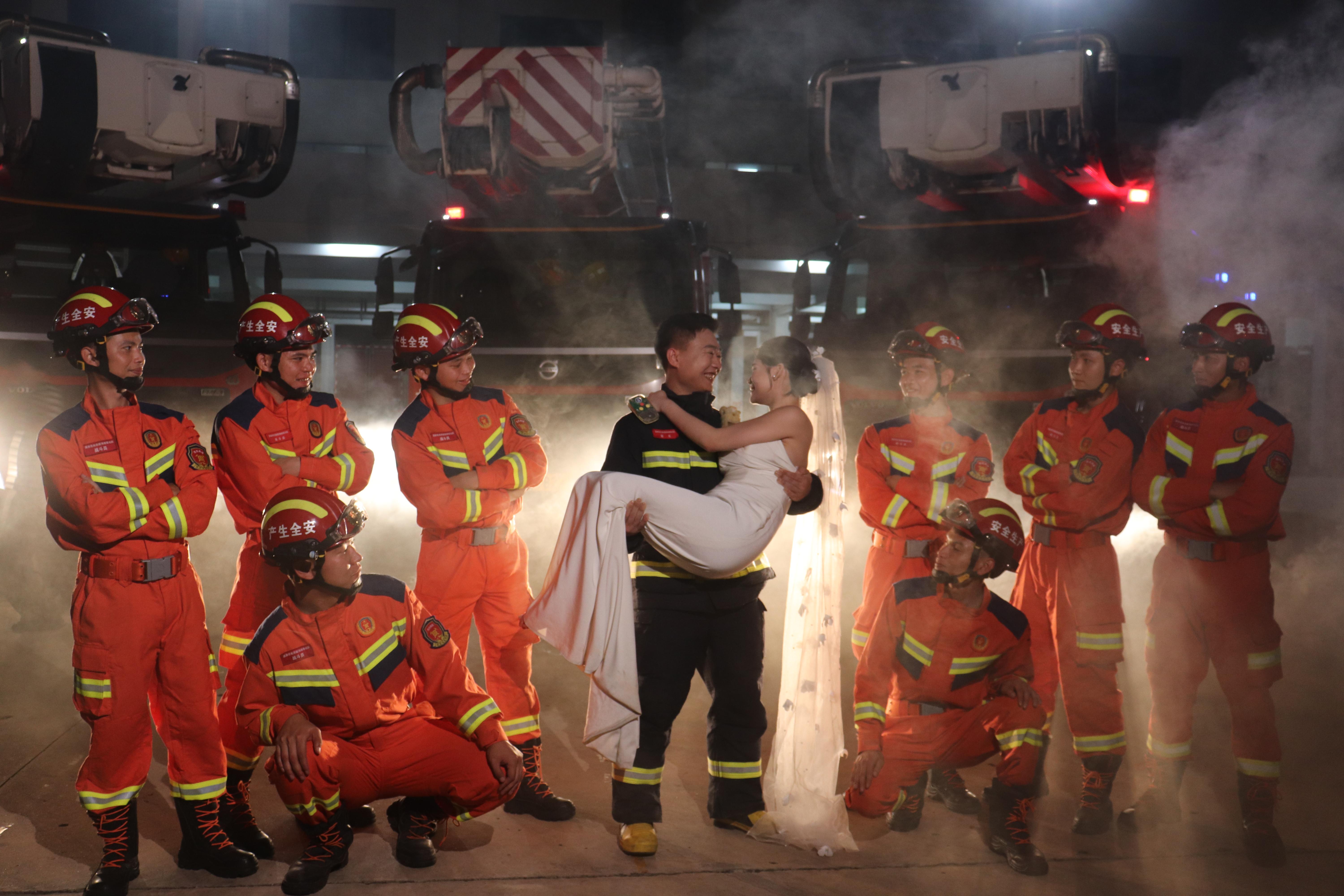 椰林白纱消防红 | 4月8日,海南炼化消防队基地中队班长符学群带着妻子来到工作岗位,在国家危险化学品应急救援洋浦基地拍摄婚纱照,留住人生最值得记忆的时刻。靳红昌 摄
