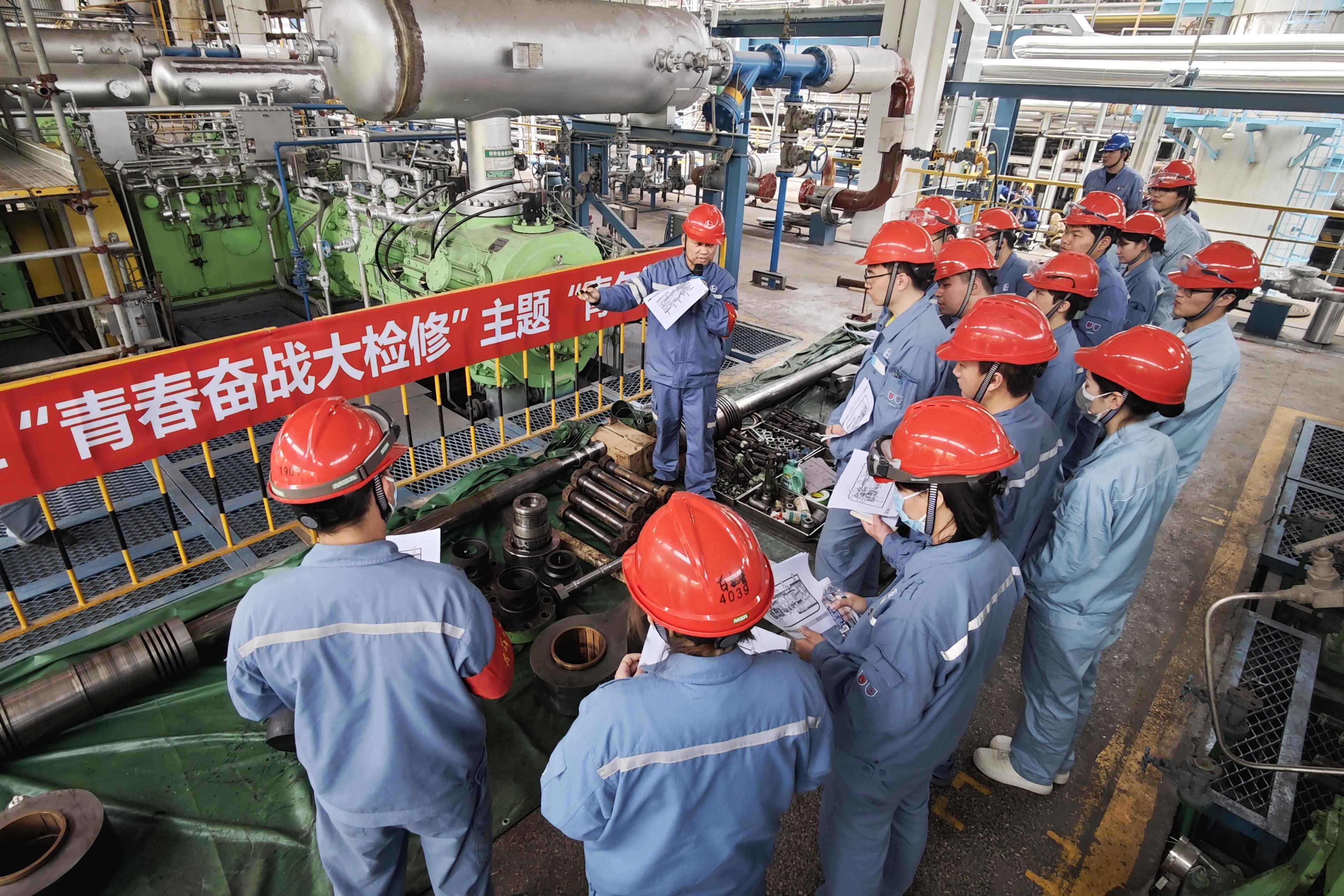 “青年讲堂”进检修现场 | 4月9日,高桥石化在装置检修现场举办“青年讲堂”活动,为青年员工带来了一场理论与实践融合的“知识盛宴”。图为青年讲师在大型机组检修现场讲解设备结构。徐峥辉 摄