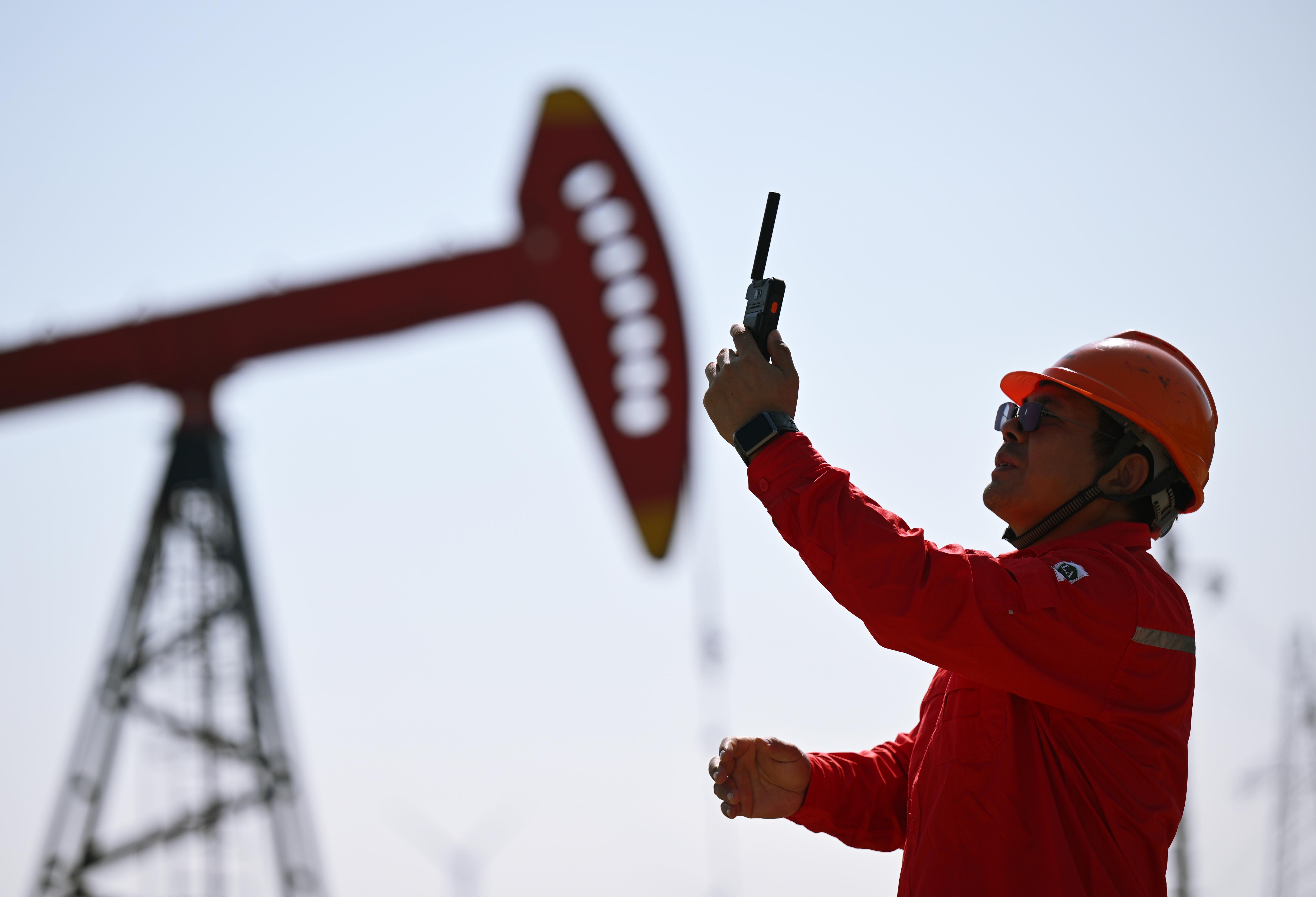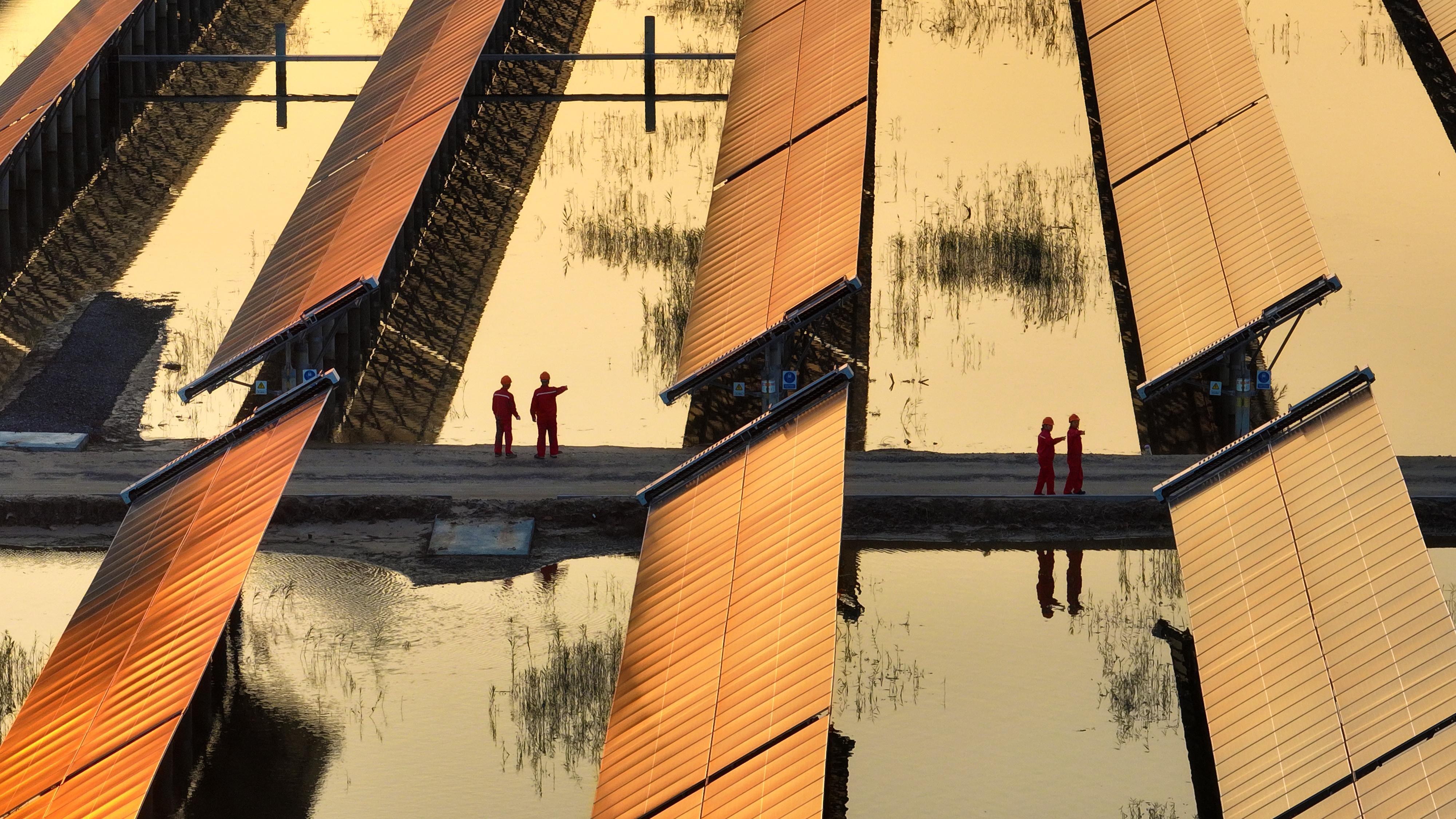 10月27日,在胜利油田孤东106兆瓦光伏区内,员工正在对储能设备和光伏设施进行巡检维护。王国章 摄